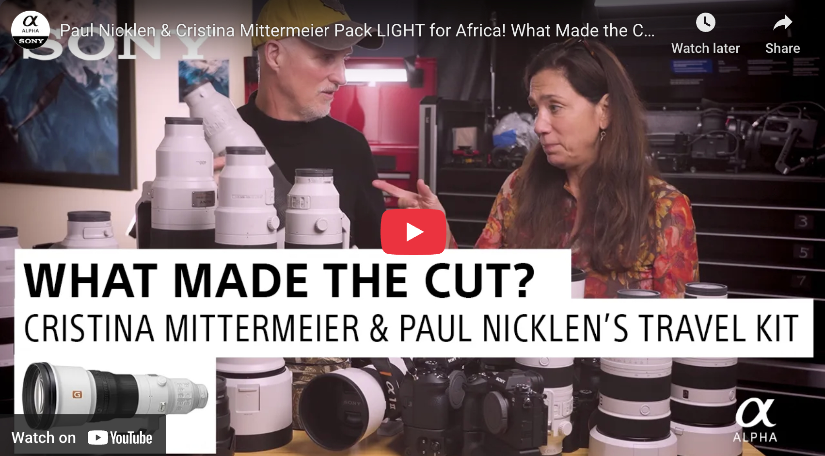 “When conservation photographers Paul Nicklen and Cristina Mittermeier head to Africa, every ounce matters. Traveling aboard small aircraft means packing light without compromising performance. Watch as they break down the Sony camera bodies and lenses that make the cut for their carry-ons.”
